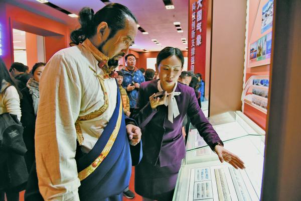 在中国邮政精心策划的《改革开放40年——中国邮票》展区,工作人员向其美多吉介绍了丰富、珍贵的邮票展品。看到其美多吉,中国邮政邮票博物馆、邮票印制局等单位的员工热情地招呼其美多吉,纷纷上前与他合影。