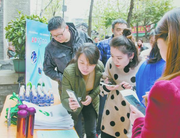3月22日是第二十七届“世界水日”,也是第三十二届“中国水周”首日。为充分发挥四川邮政公共服务平台作用,加大“节约用水”理念宣传力度,四川省水利厅联合四川省邮政分公司举行“节约用水,从心开始”2019年中国水周健步走活动。图为在成都市暑袜街邮政支局宣传展台前,市民纷纷通过扫码参加该活动。