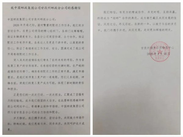 3月25日,甘孜邮政收到了甘孜州烟草公司物流中心的一封感谢信。“岁月静好,携手并进、密切合作,共同致力市场开拓。特殊时期,患难与共、同舟共济,共同呵护这片成果”,感谢信中这样写道。