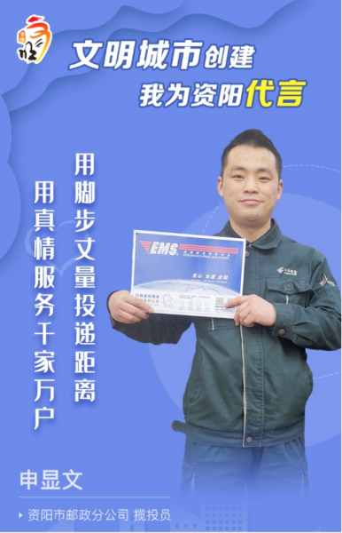 据悉,今年3月,资阳市创建文明城市指挥部办公室启动了以“创建文明城市 我们一起来”为主题的“文明城市我代言”活动,面向全市各行各业征集文明城市形象代言人及文明宣言。得知这一消息后,资阳市邮政分公司积极主动参与,向活动主办部门推荐奋战在邮政营业网点、投递、邮运驾驶等岗位的一线员工,充分展示资阳邮政的企业形象。
