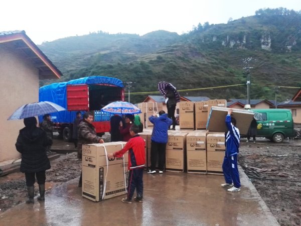 2019年9月24日,高旭闯和同事们在安置点冒雨帮贫困户搬洗衣机等电器