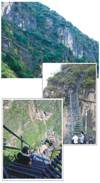 “悬崖村”地势险要,从2016年8月开始,州、县两级财政共投入100多万元,将村民原来上下山用的藤梯换成钢梯,建成后的“天梯”有2550级台阶,垂直落差800多米,依然陡峭险峻,普通人上下山耗时需四五个小时。此次上山已是高旭闯第二次带队上山工作了,由于天气炎热出汗,加之体力消耗大,他在经过“天梯”接近90度的最险要之处跌倒,滑行了近10米后用手拼命抓住钢梯,人终于没有摔落上千米的大峡谷,但手臂却划开了长长的伤口,深及骨头。强忍巨痛下山之后,伤口在昭觉县无法处理,高旭闯被紧急送往西昌治疗。经诊断,他全身多处挫伤,右手缝了20多针。至今,手臂上的伤口会在热时发痒,冷时发痛。