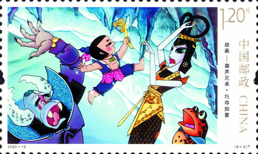 《葫芦兄弟》故事情节复杂,场面变化大,人物也较多。人物就有七个葫芦兄弟、老爷爷、蛇精、蝎子精和穿山甲等,而七个葫芦兄弟性格特点和超能力也不一样,都需要区别表现出来。从故事情节来说,不少是惊心动魄、险象环生的激烈较量场面。比如,第3枚邮票“绝路逢生”反映三娃大战群妖,打得妖怪落花流水、抱头鼠窜,画面表现的是三娃用神力斩断蝎子精的宝刀,蝎子精大惊失色的情形,此段画面是故事的一个小高潮;再如第5枚邮票“巧夺如意”主要讲述拥有隐身神力的六娃机智勇敢地盗取了蛇妖的宝贝“如意”,救出了几位兄长,此段情节尤为精彩。