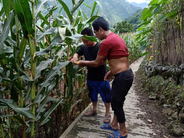 曲模布哈(左1)教农户玉米种植技术