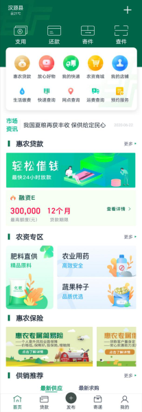 “中邮惠农”APP功能模块包括惠农贷款及还款、生活用品采购、快递寄递及查询、惠农保险、农资农技、网上开店、生活缴费、信息资讯等。
