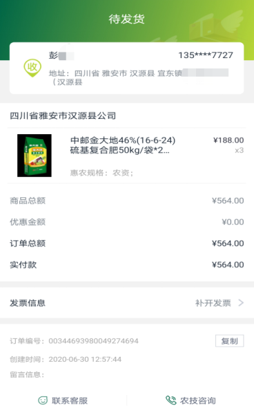6月30日12:57,农资线上销售功能测试完成。