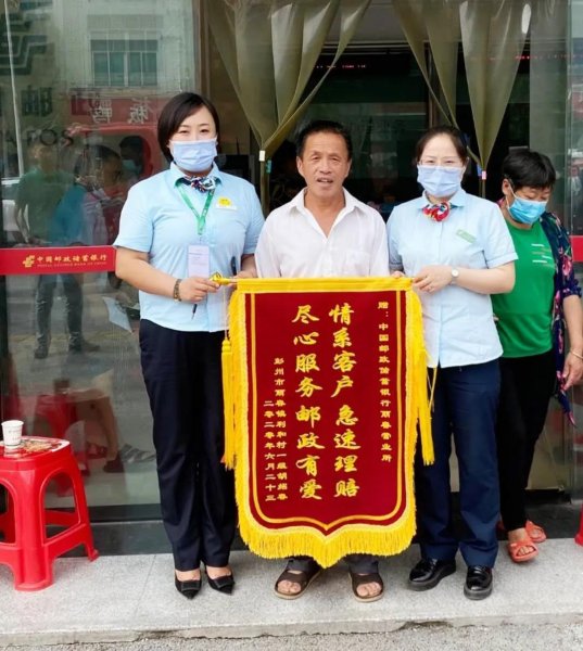 一大早,彭州市丽春邮政支局刚开始营业,客户胡绍春手持锦旗来到营业所,他的举动引来了周围客户的好奇围观,展开锦旗,只见上面赫然写着“情系客户 急速理赔 尽心服务 邮政有爱”金色大字。通过他的讲述,周围客户纷纷为丽春邮政支局的贴心服务竖起大拇指。