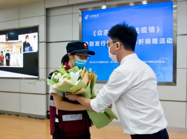 四川省人民医院、第一批四川援鄂医疗队员汪婷深情讲诉的战“疫”先进事迹让参加四川省《众志成城 抗击疫情》特别发行邮票纪念邮折捐赠活动的观众无比动容,赢得阵阵掌声。四川大学华西医院第二批、四川省第三批四川援鄂医疗队队长刘丹,四川省疾病预防控制中心均等化指导中心办公室副主任、第三批四川援鄂疾控队队长关旭静,成都中医药大学临床医学院(附属医院)急诊科副主任、武汉市红十字会医院呼吸四病区主任张宏等四川援鄂医疗队医务人员代表莅临活动现场,受到热烈欢迎。
