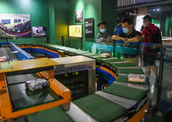 游客正在参观邮件自动分拣机模型
