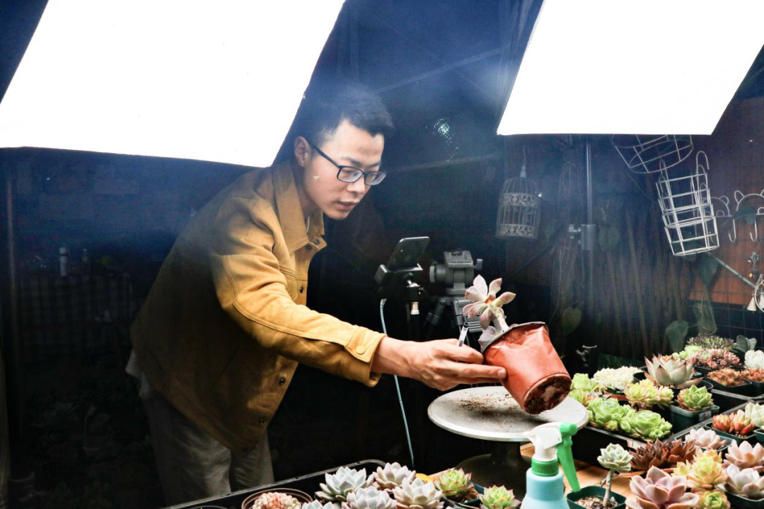 直播的时候,徐晓华全家齐上阵,自己做主播,妻子做直播小助手,姐姐负责上链接做后台运营,爸妈管后端订单发货。如今,“火”起来的“多肉小王子”徐晓华,经营着近1000种多肉植物,年销售额近500万元。