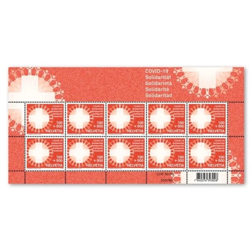 4月6日,瑞士邮政发行抗击疫情附捐邮票,全套1枚。邮票面值1法郎,附捐5法郎,按照5法郎出售,表明瑞士邮政提供无偿服务。这是第一套抗击疫情附捐邮票。邮票图案表达了瑞士民众携手抗疫的决心,捐款所得全数交瑞士团结基金会和瑞士红十字会用于应对疫情,邮票以全张为单位在瑞士邮政官网出售。