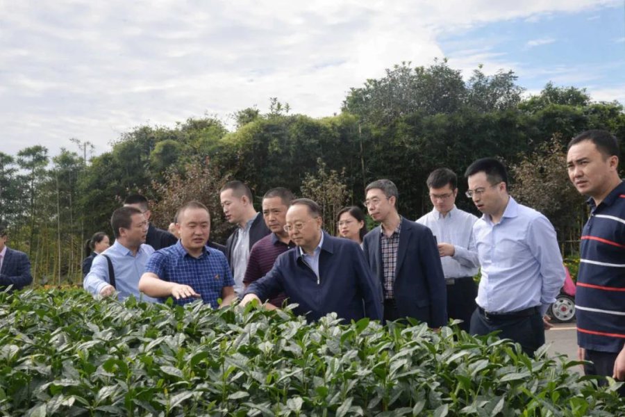廖涛在名山区解放村参观合作社茶叶基地