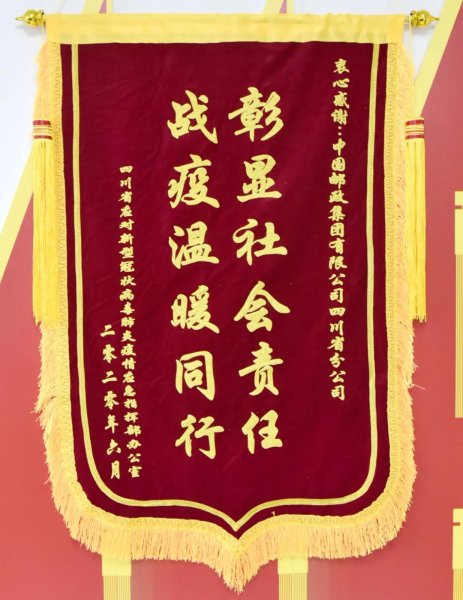 11月10日,四川省应对新型冠状病毒肺炎疫情应急指挥部继今年5月送锦旗和感谢信后,再次为中国邮政集团有限公司四川省分公司送来“彰显社会责任、战疫温暖同行”锦旗,对省分公司开展《众志成城 抗击疫情》定制邮折捐赠工作表示衷心感谢。