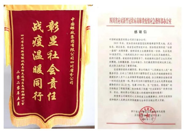 5月18日,四川省应对新冠肺炎疫情应急指挥部为中国邮政集团有限公司四川省分公司送来一面印有“战疫温暖同行,彰显社会责任”的锦旗及一封感谢信,感谢四川邮政践行“人民邮政为人民”的服务宗旨,在疫情防控的关键阶段,主动为四川援鄂医疗队开通救援物资及救援医护人员个人生活物资寄递绿色通道,全力保障防疫物资第一时间送达疫情一线。11月10日,四川省应对新型冠状病毒肺炎疫情应急指挥部再次为四川邮政送来“彰显社会责任、战疫温暖同行”锦旗,对省分公司开展《众志成城抗击疫情》定制邮折捐赠工作表示衷心感谢。
