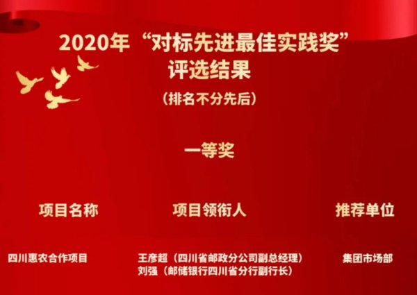 3月29日,中国邮政集团公司召开2020年劳动竞赛总结表彰暨2021年启动会。会上,集团公司评选四川惠农合作项目为2020年“对标先进最佳实践”项目一等奖,表彰四川省邮政分公司携手邮储银行四川省分行,积极发挥协同优势,形成具有四川特色的邮政惠农服务模式,以“三流”解“三难”,为服务四川地方经济发展贡献了邮政力量。