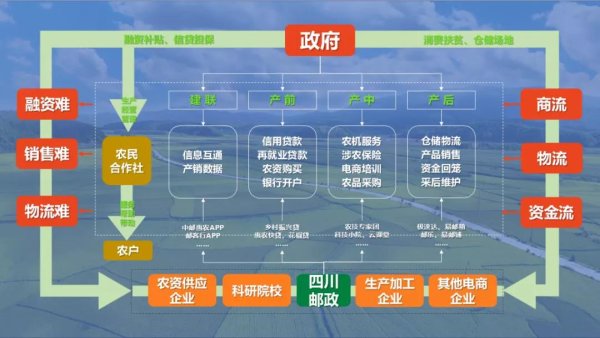 省分公司和省分行多次向省委、省政府专题汇报,成立领导小组和项目专班,深度融入农业产前、产中、产后三大环节,推出“6免6惠6专属”惠农政策和“5+12”综合服务方案。整合资源,构建“政府+邮政+合作社+上下游企业+科研院校”惠农生态圈。
