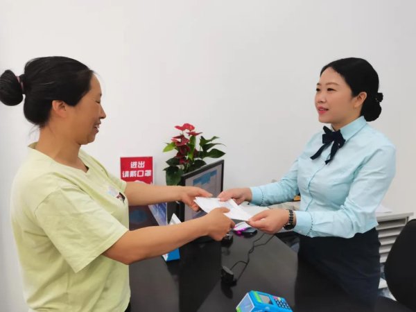 泸定县红军路邮政支局柜员廖先美贴心地把刚开好的发票递到客户手中