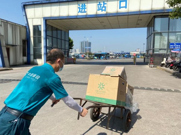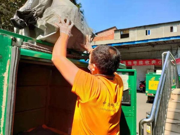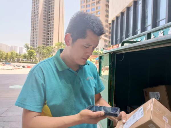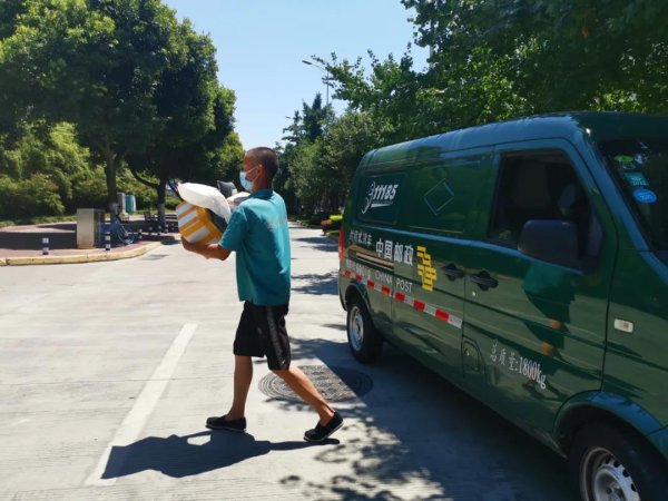 一大早,气温便陡然升高。投递员谢智抓紧时间装车,赶紧出发。