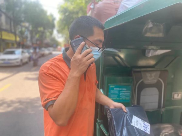 中午,投递员刘世国联系客户取件,身上的衣服已被汗水浸湿。