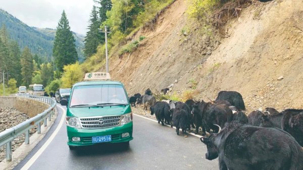 一路上,道路畅、草色黄、牦牛壮。“我们若尔盖人都喜欢牦牛,它们憨憨的,能吃苦,讲团结,懂奉献。”哈弄夺机自豪地介绍着“高原之宝”,“我刚工作时,父亲就跟我说,‘踏踏实实地干,学学牦牛’。”随后,他提醒道:“千万别大意,天气说变就变,有时候一天能遇到四季,大太阳、大雨、冰雹、大雪都有可能碰上。”果然没多久,下起了毛毛雨,不一会儿,雨势骤大,前方视线变得模糊。哈弄夺机小心地驾驶着车子,还要避让不时冲出来的成群的牦牛。