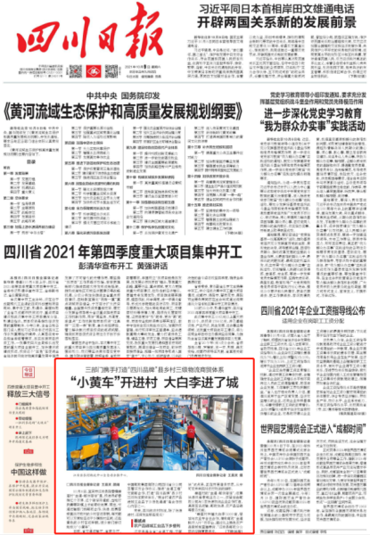10月9日,四川日报头版刊登题为《“小黄车”开进村 大白李进了城》的新闻通讯,介绍了宜宾市江安县打造“四川品牌”县乡村三级寄递和商贸物流体系的经验,现予以转发。