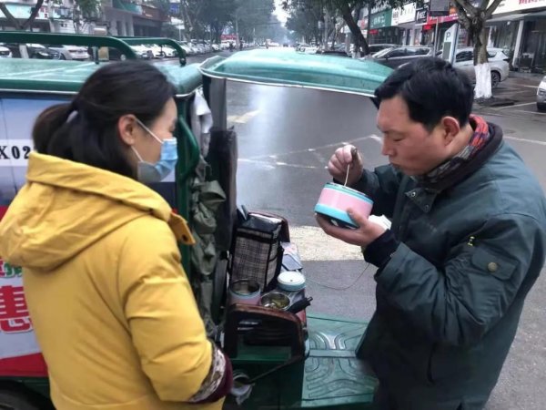 中午1点,唐小松给妻子打电话,“喂,老婆,广福街道!”不到10分钟,妻子陈平就提着饭菜骑着摩托车赶过来了。多年来,唐小松和妻子已十分默契,只要中午丈夫简单地报一个地址,妻子就心领神会。为了赶时间,唐小松坐在投递车上,不到5分钟就匆忙地结束了午餐。“为了节约时间,我中午不敢给他做鱼、大骨等吃起来费劲又花时间的菜,投递员的时间都非常宝贵,节约一分钟就可以多投递一个包裹……”妻子十分理解唐小松的工作,这么多年来默默地在背后支持他,鼓励他,家庭的温暖也让唐小松工作更有干劲。