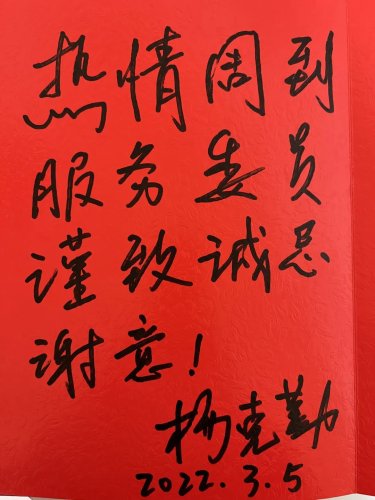 全国政协委员杨克勤写下:热情周到服务委员,谨致诚恳谢意!