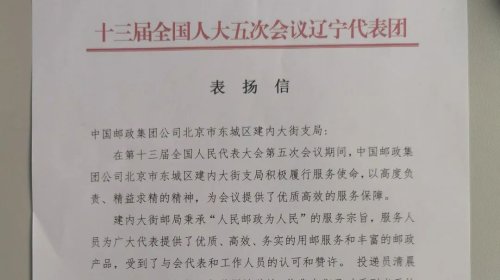 辽宁代表团在感谢信中提到,“建内大街支局秉承‘人民邮政为人民’的服务宗旨,为广大代表提供了优质、高效、务实的用邮服务和丰富的邮政产品,受到了与会代表和工作人员的认可和赞许,投递员清晨就将当天的会议用报及邮件送到驻地,保证了时限。在此向中国邮政致以诚挚的感谢,并提出表扬!”