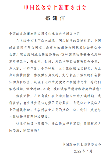 4月18日,凉山州邮政分公司收到一封来自中国致公党上海市委员会的感谢信。来信情感真切,表达了对凉山邮政邮车驾驶员千里驰援上海抗疫的由衷感谢。