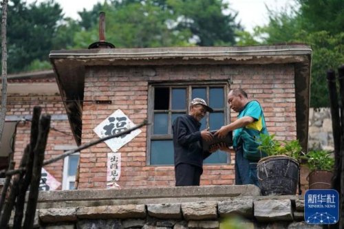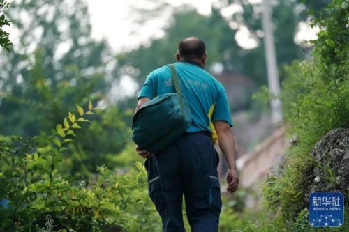 在山西省壶关县大峡谷镇师家背村,赵月芳为村民送件(7月14日摄)。新华社记者 詹彦 摄