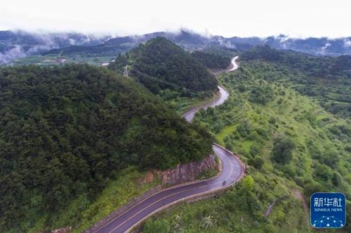 在山西省壶关县大峡谷镇,赵月芳骑行在送件的路上(7月13日摄,无人机照片)。新华社记者 杨晨光 摄