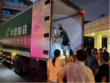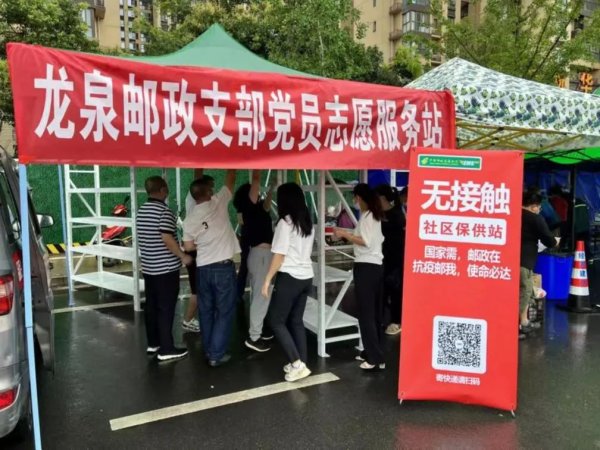 7月21日,两小时内,20余个帐篷、10个货架以及口罩等物资迅速准备到位,一个个标注着“龙泉邮政支部党员志愿服务站”的社区保供点在成都市龙泉驿内的封控小区搭建完成,保供点连接封控区,不但将包裹及时送达,还承担起了同城闪送、各平台外卖及其它快递公司的生鲜、食品、药品、文件等物品的配送。