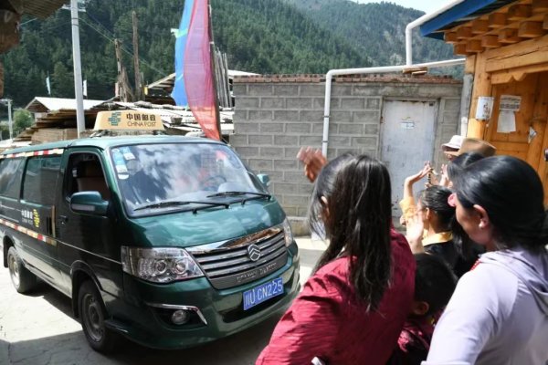 送完今天的报纸和包裹,背着最后一个邮件,哈弄夺机驾驶着邮车,回到铁布镇则隆村泽龙寨,刚进寨子,就看到家人们正站在门口等着他。