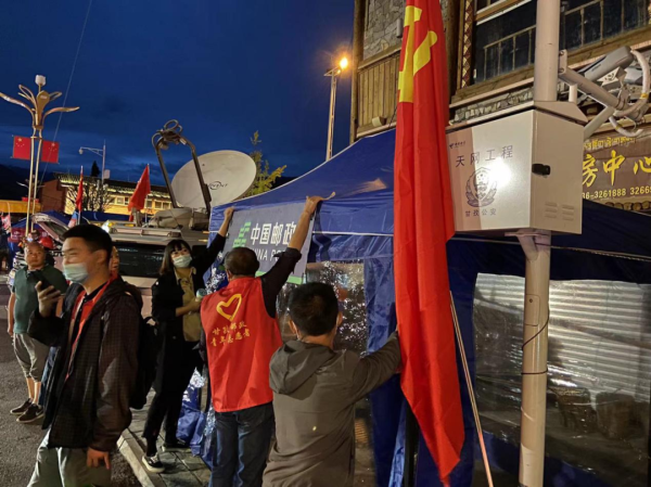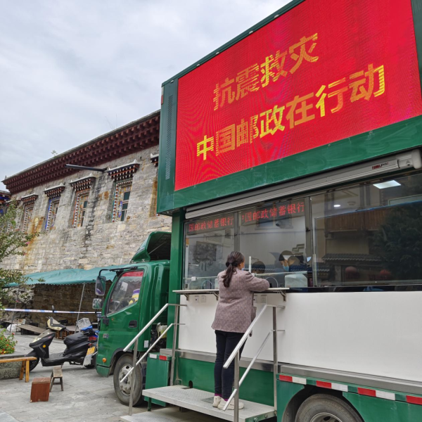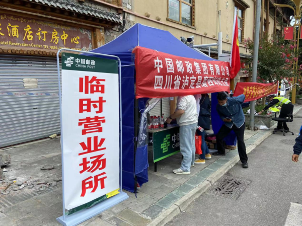 9月6日,“9·5”四川泸定6.8级地震后的第二天,泸定磨西邮政支局因受损严重无法营业,邮政流动服务车驶进震中磨西镇,泸定县邮政分公司第一时间搭建起临时帐篷邮局,恢复金融、寄递、电商等服务,开通银行卡挂失、保险理赔咨询等业务办理“绿色通道”,开展党报党刊免费赠阅,参与救灾安抚,切实满足百姓需求,传递“党的声音”,送去“党的关怀”。