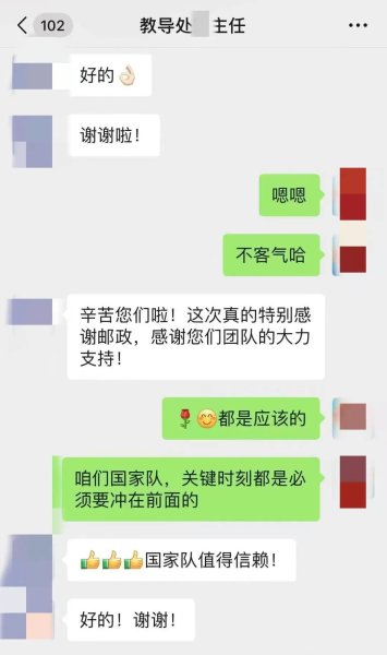 成都邮政除了统一组织各中小学校的对接工作,广大干部员工也纷纷宣传,积极推介,取得了良好的效果。锦江区分公司部员工黄俊因疫情居家办公,得知分公司正在积极开展教材寄递服务,便通过家长群主动联系自己儿子所在中学的老师及教导主任,积极推荐邮政教材寄递项目,帮助消解校方顾虑,最终达成合作意向,邮寄教材900余本。本次合作让校方非常满意,学校教导处主任称赞邮政“国家队值得信赖!”