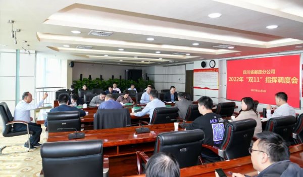 11月1日上午,在2022年“双11”电商购物节开启之际,四川省邮政分公司召开指挥调度会,进一步安排部署生产运行组织保障工作,多措并举,全力护航旺季邮件高峰。省分公司党委书记、总经理廖涛出席会议并讲话,副总经理刘晓泉、王彦超对“双11”旺季生产工作进行安排。相关部门、单位就当前组织安排和能力储备情况作汇报,成都市分公司、供应链公司远程参会。