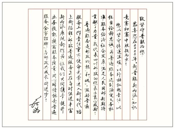 竞赛现场,主持人声情并茂地宣读了廖涛总经理的一封信《致坚守普服的您》:“恭喜您在2022年‘新普服 新内涵’知识竞赛中脱颖而出!您以坚守传递温暖,以行动扛起责任,以担当诠释忠诚,为普遍服务达到法定义务标准、服务经济社会发展、满足人民用邮新期待贡献了力量,我代表四川邮政向您表示衷心感谢!……”亲切温暖的话语感动和激励了在场每一个人。