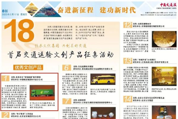 2月17日,中国交通报社公布了“传承文化基因 共创美好生活”首届交通运输文创产品征集活动优秀文创产品。四川省邮政分公司推送的其美多吉“雪线邮路”邮车模型在406件文创产品中,经过初评、线上投票、终评、公示等环节脱颖而出,成为18件优秀文创产品之首。