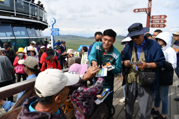 在景区里向游客发放