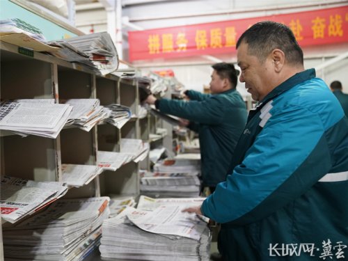郭红岗(右一)在分拣报纸。长城网·冀云客户端记者 刘俐验 摄