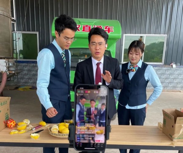 邮政员工携手网红村支书关祖苹(中)开展助农直播