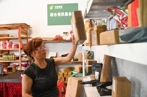 快递抵达后,超市老板商兴菊按照手机尾号把快递分拣在货架上。这家超市每天营业时间从早上六点至晚上十一点,村民在外干完农活可以随时到超市免费取快递。