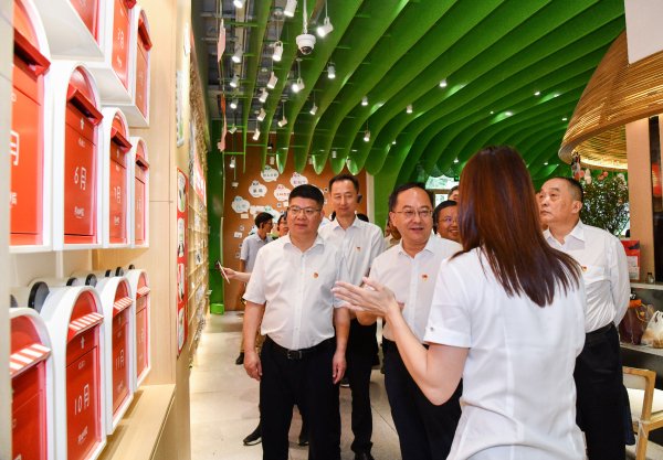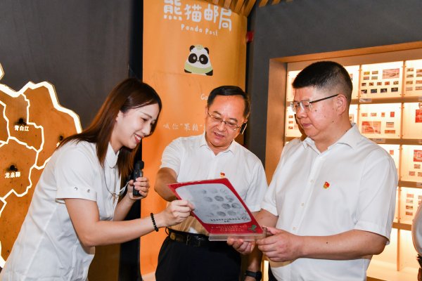 杜和平一行在纪念戳加盖处、明信片展示墙、邮品区、文创产品区仔细察看地方特色主题邮票、巴蜀风韵文创产品等经营销售情况,对熊猫邮局以邮政文化为基础,创新文传传播方式表示肯定和赞赏。