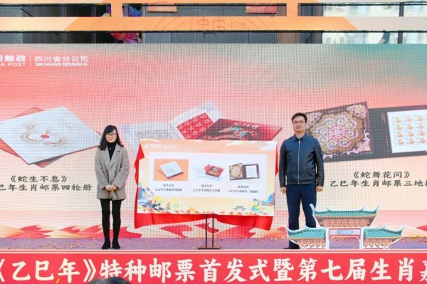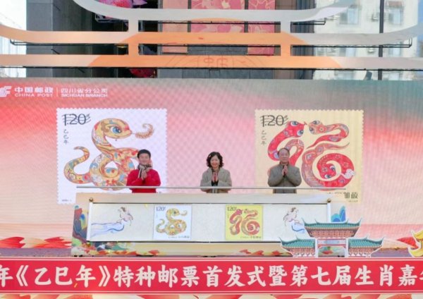灵蛇献瑞,福纳百祥。1月5日,由四川省邮政管理局、四川省邮政分公司、四川省集邮协会主办的“2025年《乙巳年》特种邮票首发式暨第七届生肖嘉年华”在成都文殊坊锦城熙剧场举行。