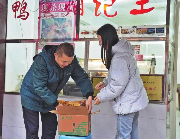 乐山甜皮鸭以其焦香酥脆、嫩滑多汁的独特风味,成为当地春节的“年货担当”,也令游客钟爱有加。赵女士即将结束旅程,她来到王师傅的店里,想买两只鸭子寄回家。刚出锅的鸭子一塑封好,就被店外邮政收寄点的揽收小哥接过去,熟练地裹上冰袋、贴上“极速鲜”标签,打包封装后送上车,整个过程方便快捷。