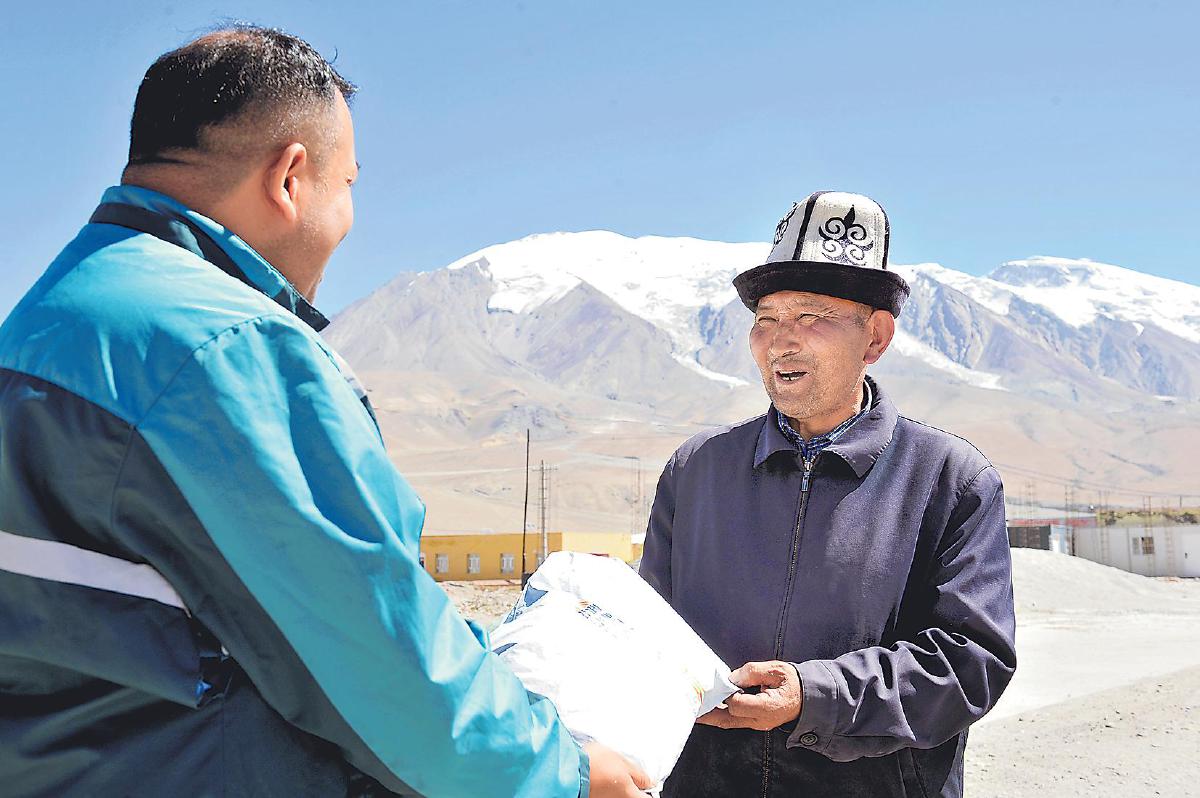 阿克陶县邮政分公司投递员阿不都赛米·赛买提为当地村民送包裹上门。
