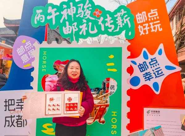 值得一提的是,本次活动在现场特别设置了“光影邮廊”邮票展和互动市集活动,并在熊猫邮局暑袜街旗舰店设立了《丙午年》特种邮票巨幅海报打卡点。同时,全省21个市州联动启动“百马寻踪”集章打卡,市民可通过观邮展、集印章、拍合影等丰富形式,在互动中沉浸式体验生肖文化、邮政文化与城市记忆的融合。