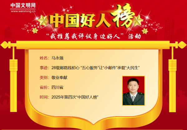 1月23日,“中国好人榜”发布仪式在宜宾市李庄古镇举行,备受关注的2025年第四批“中国好人榜”揭晓。经过各地推荐、网友评议和专家评审等环节,全国共有139名助人为乐、见义勇为、诚实守信、敬业奉献、孝老爱亲的身边好人光荣上榜。其中,四川省宜宾市邮政分公司马永强上榜,获评“敬业奉献好人”。