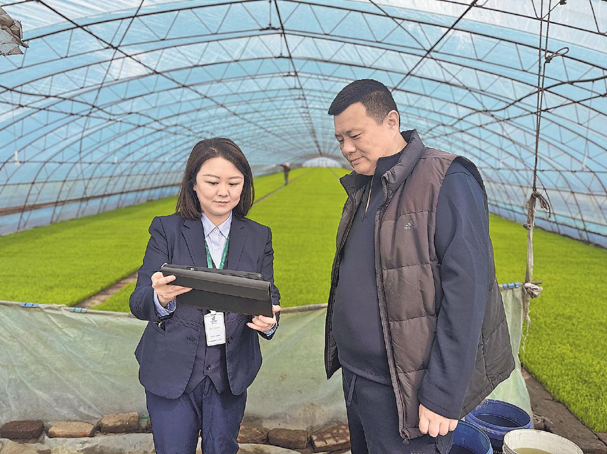 建三江支行客户经理运用移动展业设备为农户匹配金融服务方案。(图片由黑龙江省分行提供)